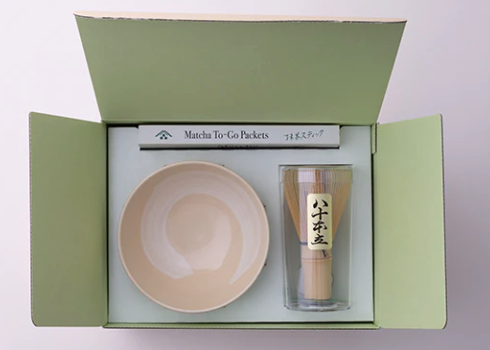 The kit contains the minimal items required to start enjoying matcha: a tea bowl, whisk, and Matcha To-Go Packets. It’s an extremely simple set that allows you to prepare matcha. All you need to add is the hot water.
